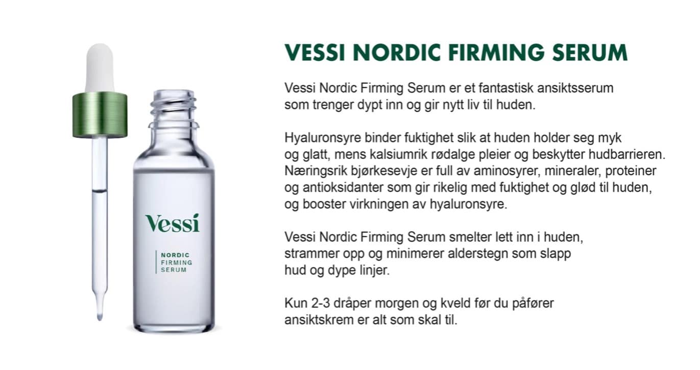 Vessi Nordic Firming Serum er udviklet i Norge og består af 97% naturlige ingredienser samt arktisk kildevand. Det er et serum, der er helt fri for skadelige kemikalier, parabener, sulfater, plastik eller ingredienser, der kan være hormonforstyrrende. Vi ved, at naturlig hudpleje er det bedste udgangspunkt for en sund og strålende hud.