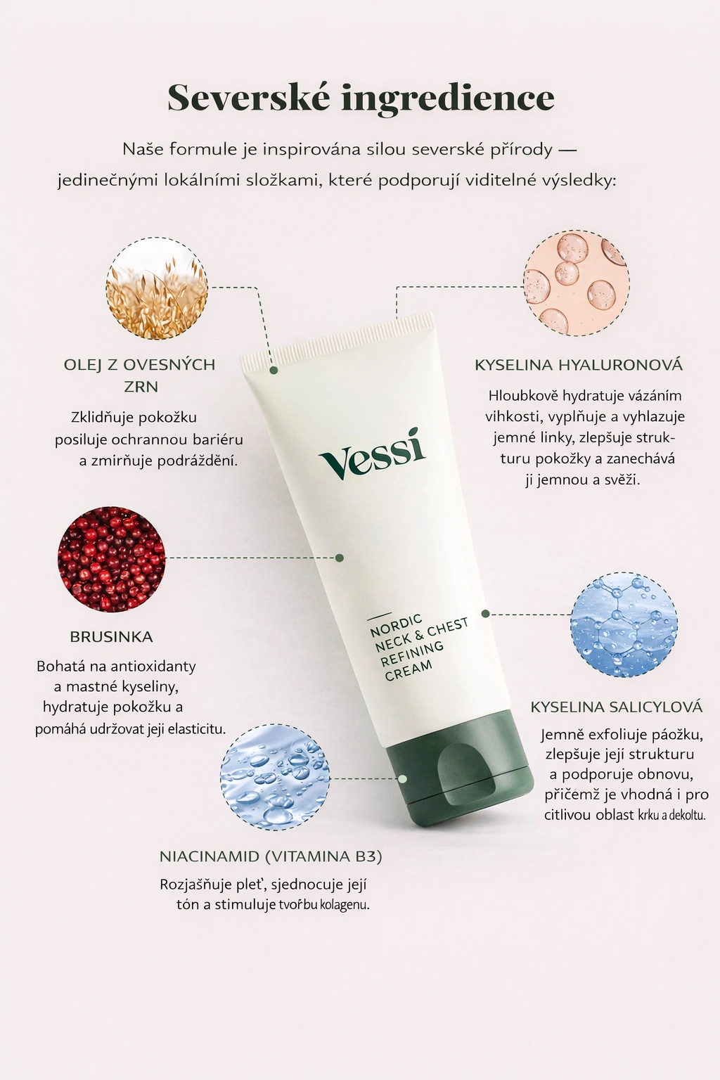 Vessi Nordic Neck & Chest Refining Cream obsahuje vyživující složení navržené pro hloubkovou hydrataci jemné pokožky krku a dekoltu. Zároveň poskytuje zpevňující a vyhlazující účinky, které pomáhají redukovat vrásky, nedokonalosti a jemné linky a dodávají pleti mladistvější vzhled.
