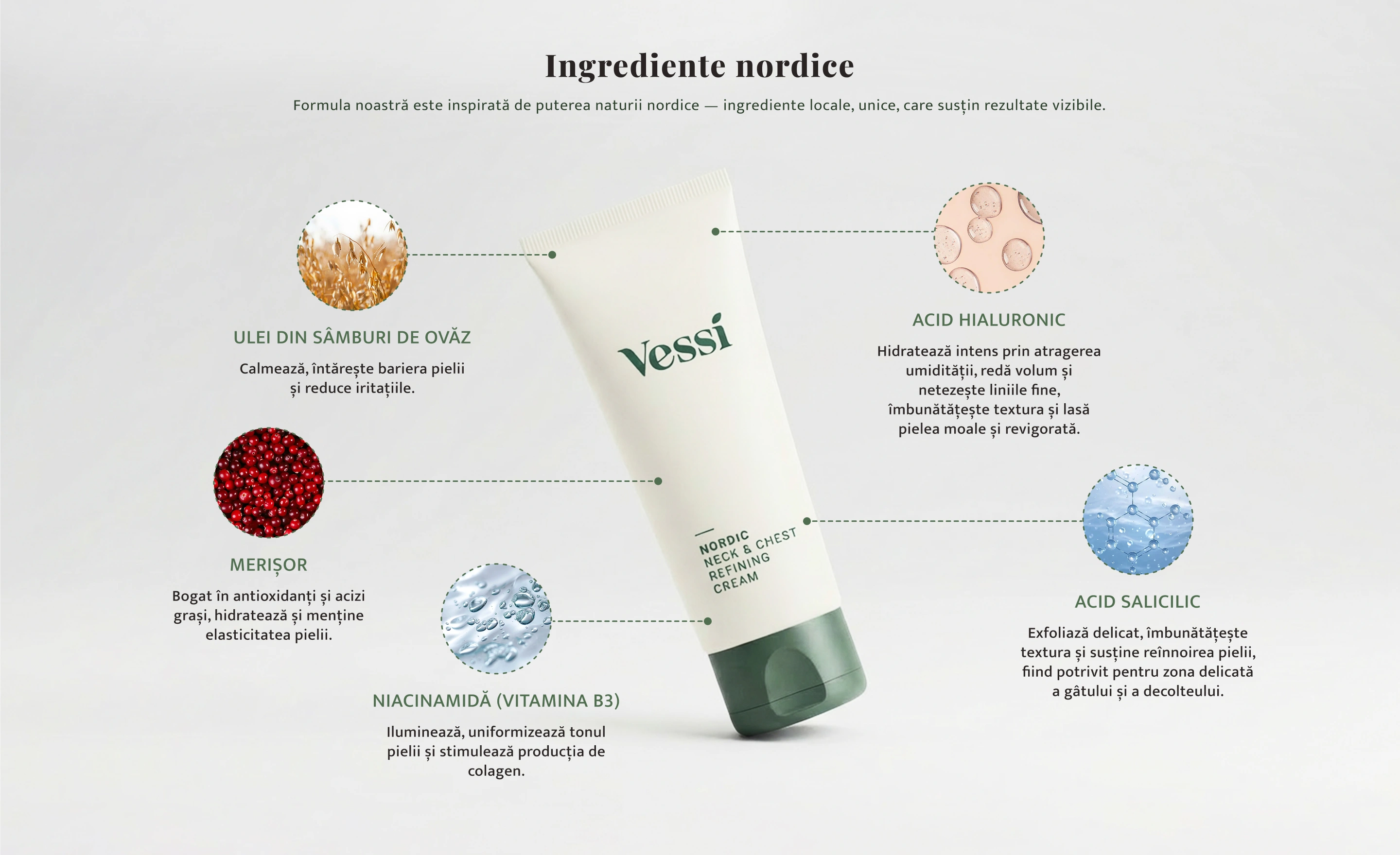Vessi este o gamă de produse pentru îngrijirea pielii dezvoltată în Norvegia, care conține extracte și uleiuri pure din plante și fructe de pădure sălbatice din natura nordică. Aceste ingrediente sunt deosebit de nutritive datorită conținutului ridicat de vitamine, antioxidanți, acizi grași și compuși botanici. Punem accent pe puritate și calitate, motiv pentru care alegem ingrediente obținute în mod sustenabil, care păstrează cât mai bine concentrația ridicată de substanțe active. Combinăm aceste ingrediente cu ingrediente dovedite și eficiente, precum niacinamida, acidul hialuronic, squalanul și pantenolul. Această combinație oferă produse eficiente pentru diverse nevoi ale pielii, rămânând în același timp delicate. Toate produsele sunt îmbogățite cu apă de izvor arctică din Finlanda.