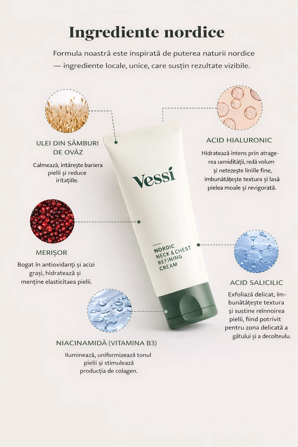 Vessi Nordic Neck & Chest Refining Cream conține ingrediente cu eficiență dovedită și care sunt blânde cu toate tipurile de piele, chiar și cu cele foarte sensibile. Totuși, trebuie reținut că produsul conține 2% acid salicilic, care trebuie evitat de femeile însărcinate.